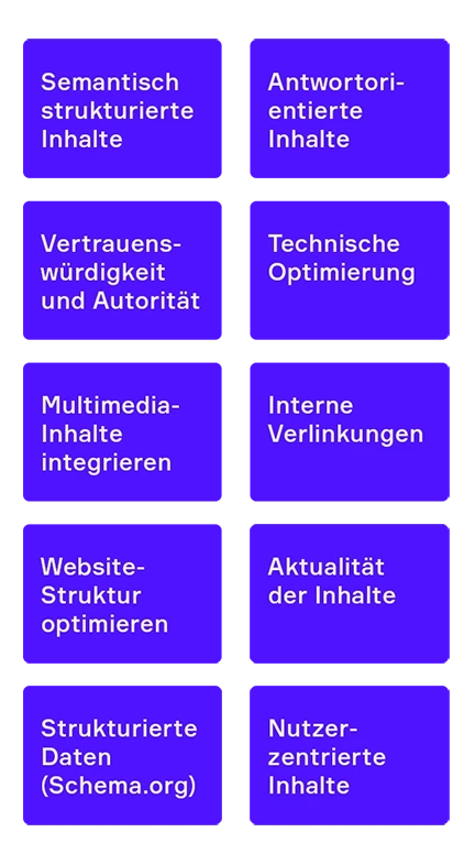 Wir gestalten Inhalte so, dass sie nicht nur klassische Suchmaschinen, sondern auch KI-gestützte Systeme wie ChatGPT, Perplexity & Co. optimal verstehen. Dazu zählen strukturierte Inhalte, semantische Tiefe und clevere Formatierung, z. B. als Fragen-Antwort-Logik oder Listendarstellung.