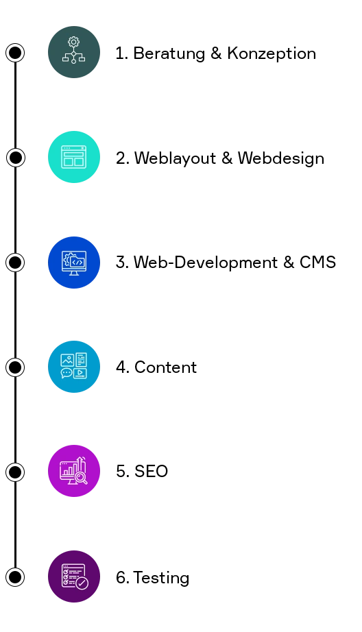 6. Testing & Launch: Zum Abschluss führen wir umfassende Tests durch, um sicherzustellen, dass die Website in allen Bereichen optimal funktioniert. Nach Freigabe erfolgt der Live-Gang.